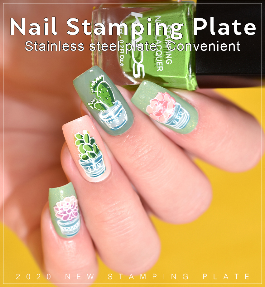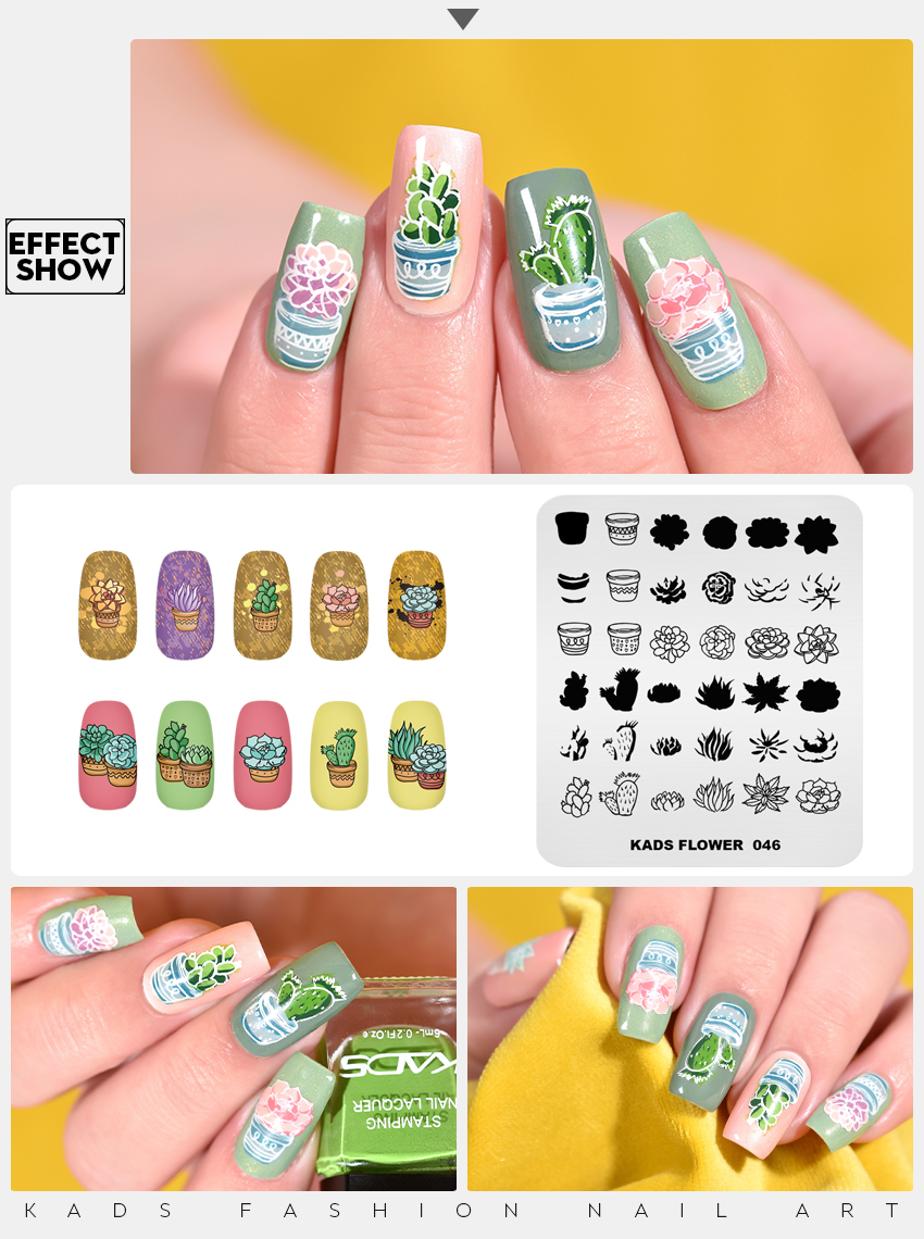 | You might have noticed that the succulents and pots on this stamping plate are nicely organized. With each pattern being etched in three varying depths, you can combine them together on your nail bed for three-dimensional effects. Pay attention to color combination and you’ll achieve much more natural plant designs.