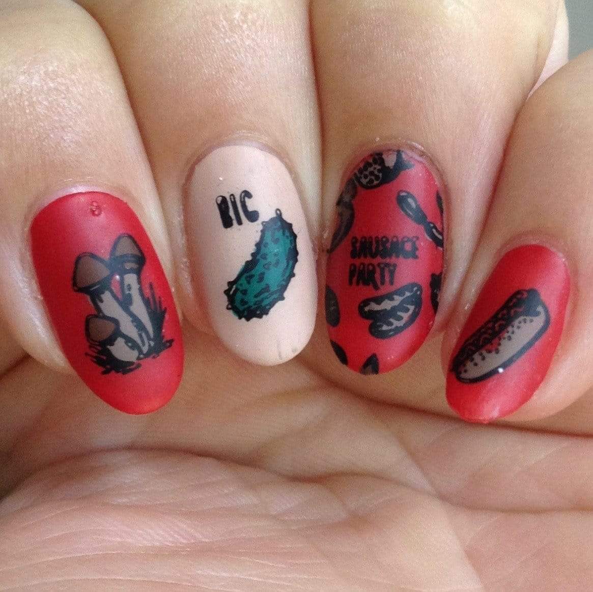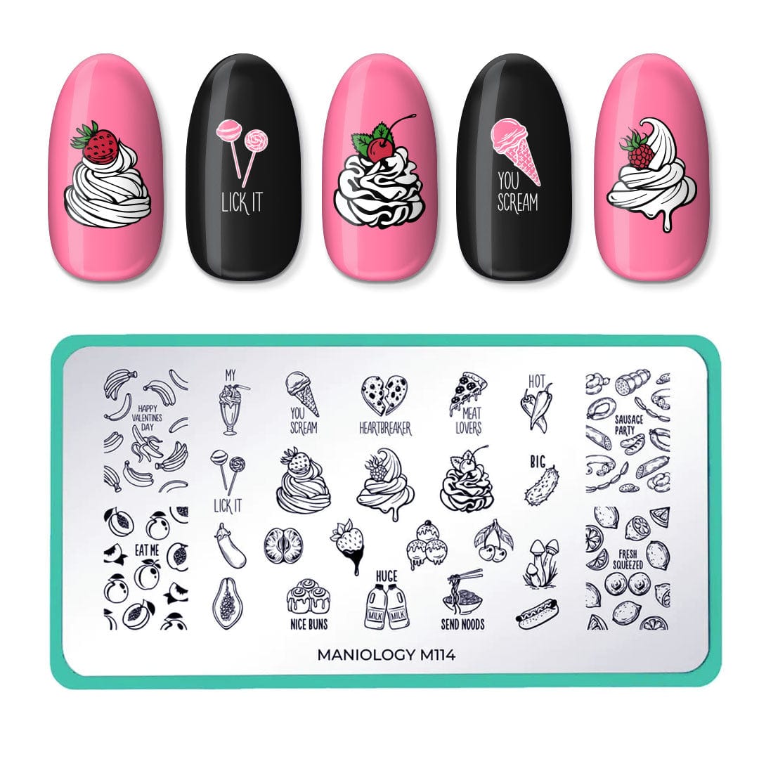 | ¡Ya sabes cuánto nos ENCANTA la comida! 😜 Esta placa de estampación Forkin’ Love Ya (m114) está repleta de imágenes deliciosas que te harán salivar. ¿Hambrienta/o? Tenemos algo para que te deleites. Amantes de la carne, ¡únase a nuestra fiesta de salchichas!, y cuando te apetezcan dulces, sacia tu antojo con unas frutas frescas, maduras y jugosas. Este San Valentín, lucirás una manicura que te hará parecer un bocado irresistible. ¿Qué…? ¡Fuera pensamientos impuros! Es solo comida.